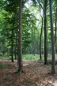 Eine weitere interessante Erscheinung ist nördlich zu beobachten - in einer ausgedehnten Mulde, die vom Landberg nach Westen zu Schmieders Graben herabreicht: Über Sandstein und Tonschiefer befindet sich eine mehr oder minder vernässte Lößlehmschicht, die von einem Quellkomplex durchsetzt ist. Auf dem Boden liegen Gerölle von Sandstein und Basalt. Am Beginn eines kleinen, vom Jagdweg nach Norden abzweigenden Pfades, grüßt rechter Hand zuerst der Waldmeister. Was folgt, ist zunächst eher ungemütlich - viel Brombeere. Dazu kommen Drahtschmiele und Heidelbeere. Ein Stück weiter - ein Fleck des seltenen Sanikels, dann Wald-Schachtelhalm, später Wald-Zwenke, Wald-Segge und die in Sachsen ebenso seltene Wald-Gerste. Der Boden wird nass, aber reich. Im Kern des Gebiets finden sich ausgedehnte Erlen-Eschen-Quellwälder, in denen meist die künstlich begründete (d.h. gepflanzte) Erle vorherrscht. Neben Quellzeigern wie Berg-Ehrenpreis, Hexenkraut, Sumpf-Pippau, Sumpf-Vergissmeinnicht, Bitterem Schaumkraut, Winkel-Segge sind Kleiner Baldrian, Wald-Gerste, Kriech-Günsel und Gundermann anzutreffen. Ein nördlich angrenzender Eschen-Ahornbestand birgt Leberblümchen, Goldschopf-Hahnenfuß, Sanikel, Waldmeister, Ruprechtskraut, Echte Nelkenwurz und Seidelbast. Weiter südlich finden sich kleine Torfauflagen, hier wächst Bittersüßer Nachtschatten und Rauhaariger Kälberkropf. Leider sind die feldnahen Bereiche stark von Brombeere überwuchert, ein Zeiger starken Stickstoffüberschusses.