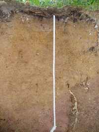 Geht man auf dem Floßweg weiter nach Nordwesten, trifft man rechter Hand auf einen Braunerde-Pseudogley. Das ist ein Bodentyp, der durch Stauwassereinflüsse gekennzeichnet ist. Das entsprechende Merkmal ist die "Marmorierung", die durch senkrechte helle Streifen im ansonsten braunen Profil entsteht.