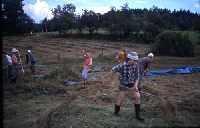 Heute werden Wiesen gemäht. Hurra ich kann Sensen! Das ist schon was anderes als diese plumpen elektromechanischen Rasenmäher. Beim Wetzen der Klinge schneide ich mir auch prompt in den Daumen, eine stete Erinnerung an meinen ersten richtigen Sensengebrauch. Heute stößt noch Andreas zu uns, der Förster, Jäger, Naturschützer und wohl noch einiges mehr in sich vereint.