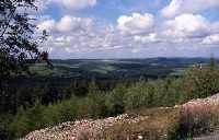 Besagtes Absterben der Fichtenforsten hat am Pöbelhang eine eindrucksvolle Aussicht in Richtung Südwesten freigegeben. Der Blick wandert über die flache, allmählich von Nord nach Süd ansteigende Horizontlinie. Zu sehen ist ganz rechts (noch! - die aufwachsenden Lärchen begrenzen immer mehr das Blickfeld) die Burg Frauenstein (674 m hoch/10,5 km entfernt), anschließend (hinter Hermsdorf und Seyde) der Kannelberg (805 m/7 km), als nächstes die Holzhauer Steinkuppe (806 m/8,5 km) und geradeaus, auf dem Kamm, der höchste Berg des Ost-Erzgebirges, der Wieselstein/Loucna (956m/15 km). Links führt der Ausblick weiter zum Bournák/Stürmer (869 m/10,5 km), zum Keilberg/Klínovcík (836 m/9 km) und letztlich zur zweithöchsten Ost-Erzgebirgserhebung, dem breiten Rücken des Bornhau/Pramenác (909 m/9,5 km). Auf der Tafel am Aussichtspunkt ist ganz links noch der Kahleberg (905 m/4,5 km verzeichnet, doch den hat bereits der im Vordergrund aufwachsende Forst wieder verschluckt.