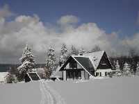 Vom Abfahrtshang Neuschellerhau bietet sich ein schöner Blick über den langgestreckten Ort Schellerhau. Gut zu erkennen sind die von Steinrücken gegliederte Flur sowie die weit verstreuten Häuser am Matthäusweg im Salzleckengründel.