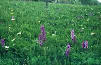 Steil und abwechslungsreich ist der Abstieg vom Geisingberg hinab ins Tal des Roten Wassers. Ein schmaler Pfad führt zunächst über die Wiese unterhalb des Steinbruches und trifft am unteren Rand auf einen einstmals als Wanderroute markierten, heute aber kaum noch benutzten Weg. Auf der genannten Wiese finden wir neben einer Vielzahl von Berg- und Frischwiesenarten (Bärwurz, Weicher Pippau, Ährige Teufelskralle, Zickzack-Klee, Rundblättrige Glockenblume, Flaumiger Wiesenhafer, Wiesen-Labkraut und viele andere) auch zwei Orchideenarten: zum einen die am Geisingberg sehr häufige Breitblättrige Kuckucksblume, zum anderen das Stattliche Knabenkraut. Die beiden rot-violetten Orchideen gehören, auch wenn sie sich auf den ersten Blick ähneln mögen, zu zwei verschiedenen Gattungen. Die Gattung Kuckucksblume (lateinisch: Dactylorhiza) hat einen bis zum Blütenstand beblätterten Stengel, ja sogar zwischen den einzelnen Blüten befinden sich kleine Laubblätter. Die echten Knabenkräuter (lat. Orchis) verfügen nur über eine Grundblattrosette. Das Stattliche Knabenkraut war früher ebenfalls im Ost-Erzgebirge verbreitet. Intensive Landwirtschaft, Bodenversauerung und Brachfallen von Wiesen (bzw. deren Aufforstung) haben jedoch nur noch wenige größere Vorkommen übrig gelassen. Eines davon befindet sich am Geisingberg, vorrangig auf den Wiesen des Osthanges.