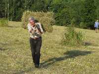 Ah, jetzt kommt die Arbeitsansage. Für Nachmittag ist Regen angekündigt? Das Spiel kennen wir doch noch vom letzten Jahr: Plane runter, Heuhaufen breitmachen, Wolke am Himmel, Heuhaufen zusammenrechen, Plane wieder drüber, Wolke weg, Heuhaufen breitmachen ... Ach nee: Pressen ist schon angesagt. Also das ganze Heu erstmal nur "breed'n", wie die Sachsen sagen, nachher auf dünne "Schlodn" ziehen. Ausdrücke haben die hier!
