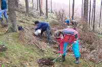 2001 begann deshalb die Grüne Liga Osterzgebirge in der Gegend mit einem eigenen Waldumbauprogramm. Mit vielen freiwilligen Helfern werden seither jedes Jahr beim "Bäumchen-Pflanz-Wochenende" rund eintausend kleine Laubbäume und Weiß-Tannen gepflanzt. Anders als bei entsprechenden "Voranbauten" des Staatsforstes setzt der Umweltverein dabei auf größtmögliche Vielfalt. Neben den als Hauptbaumarten der "potenziell natürlichen Vegetation" angesehenen Buchen und Tannen kommen auch Eiche, Esche, Ahorn, Linde, Ulme, Eberesche und Espe zum Einsatz. Bei den nährstoffarmen Böden der Sachsenhöhe benötigen die anspruchsvolleren der heimischen Baumarten etwas Starthilfe in Form eines halben Eimers "Biotoppflegekompost" (aus dem Wiesenschnitt von Nassflächen gewonnen, der nicht zu Heu getrocknet werden kann) plus etwas Kalkmergel. Das Ergebnis ist ganz überzeugend - und selbst für die Grüne Liga teilweise überraschend: zu den am besten gedeihenden Arten gehören die Berg-Ulmen, denen anfangs kaum eine Überlebenschance auf dem kargen Standort eingeräumt wurde. Das Ziel der gesamten Aktion besteht darin, dass die vielen, verschiedenen Laubbäume mit ihrer gut zersetzlichen Laubstreu das Leben in den Böden aktivieren, immer mehr Bodenorganismen dann die im Rohhumus gespeicherten Nährstoffe mobilisieren, den Pflanzenwurzeln zur Verfügung stellen und somit die Wachstumsbedingungen insgesamt verbessern. Starthilfe zur Selbststabilisierung eines Ökosystems, sozusagen. Diese funktioniert allerdings nur hinter Zaun, sonst setzen Rehe dem Experiment ein frühes Ende.