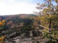 Von der "Bastei" bietet sich ein reizvoller Ausblick, unter anderem hinüber zum ausgedehnten Laubwaldhang des "Roten Busches", auf der anderen Seite des Tales.