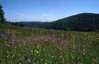 Westlich der Kohlhaukuppe hat sich das Pfarrwasser sein Tälchen geschaffen. Zwischen dem Bach und dem Sommerweg erstrecken sich mehrere, durch Steinrücken voneinander getrennte Wiesen. Eine davon ist 1990 als Flächennaturdenkmal "Wiese am Sommerweg" unter Schutz gestellt worden. Neben vielen weiteren Berg-, Feucht- und Nasswiesenarten findet man hier eines der letzten größeren Vorkommen der Gefleckten Kuckucksblume. Meist Anfang Juni entfaltet diese Orchideenart ihre hübschen rosa Blütenstände. Selbstverständlich ist das Betreten eines Flächennaturdenkmales aus gutem Grund verboten, aber hier hat man auch vom Wege aus die Möglichkeit, sich an diesem Bild zu erfreuen.