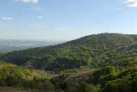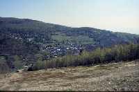 Direkt südlich sind dies der Zlatník/Schladniger Berg (522 m) und Europas größter Klingsteinfelsen, der Boren/Borschen (539 m), dahinter Mila (510), Rana (457) und Oblik (509 m). (Es gibt kaum etwas Schöneres als einen April-Ausflug zu diesen "Steppenbergen" am Südwestrand des Böhmischen Mittelgebirges, wenn auf den Trockenrasen die Küchenschellen und auf den Nordhängen die Leberblümchen blühen!). Im Südosten, hinter den Tagebauen von Bilina, steigt das eigentliche Massiv des Böhmischen Mittelgebirges aus der Ebene. Der erste Berg dieser Flanke ist der Hradišt'any/Radelstein (752 m). Uneingeschränkt beherrscht der spitze Kegel des Milešovka/Milleschauer (837 m) das Bild, links daneben der Kletecná/Kletschen (706 m, "Kleiner Milleschauer"). Zwischen beiden schaut der Doppelgipfel des Lovoš/Lobosch (570 m) hervor. Bei guter Sicht kann man dahinter den etwa 50 Kilometer entfernten tschechischen Nationalberg Ríp/Georgsberg bei Roudnice/Raudnitz erkennen. Jenseits des Elbtales, im Osten, fällt der Sedlo/Hoher Geltsch (726 m) auf.