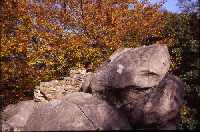 Im früher Eichbusch genannten Waldgebiet westlich von Osek/Ossegg verbirgt sich eine spektakuläre Felswildnis, wie man sie wohl im Elbsandsteingebiet, aber kaum hier am Südfuß des Erzgebirges erwarten würde. Es handelt sich um harten Quarzit-Sandstein, der jedoch viel jünger ist als die kreidezeitlichen Sedimentgesteine des Elbtales und auch eine andere Entstehungsgeschichte hinter sich hat. Im Jungtertiär - der Kamm des Erzgebirges hatte sich bereits emporgehoben und das Nordböhmische Becken sich abgesenkt - lagerte hier ein von Norden kommender Fluss überwiegend grobe Sande ab, die die Verwitterung zuvor aus den Gesteinen des Erzgebirges gelöst hatte. Eingeschlossen wurden in den Sedimentfrachten auch Süßwassermuscheln. Später verfestigte Kieselsäure das Lockermaterial zu einem grobkörnigen Sandstein ("Diagenese"). Der Kenner entdeckt an den Felsen fossile Abdrücke der erwähnten Muscheln.