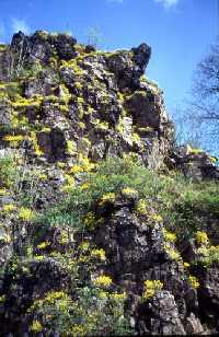 Wer im Mai durch Rechenberg kommt, dem fallen mit Sicherheit die leuchtend gold-gelben Blütenteppiche am Burgfelsen auf. Es handelt sich um das Felsen-Steinkraut, eigentlich eine wärmeliebende Pflanze, die beispielsweise im Böhmischen Mittelgebirge oder im Elbtal bei Meißen zu Hause ist. Offenbar fühlt sich das dekorative Blümchen aber an der von der Sonne beschienenen Südwand des Rechenberger Burgfelsens recht wohl. Angesät haben soll es, laut Chronik, 1881 ein Kirchschullehrer. Der Fels selbst besteht aus Gneis, in dessen Spalten Quarz eindrang, was dem Gestein eine außerordentliche Festigkeit verlieh.