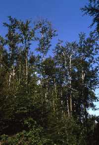 Vielen Baumarten bereitet dies existenzielle Probleme. Gemeinsam mit den ebenfalls zunehmend aus den Stickoxiden resultierenden sauren Niederschlägen (NO2 + H2O à H2NO3 = salpetrige Säure) und anderen Faktoren gehört Ozon zu den wesentlichen Ursachen der sogenannten "Neuartigen Waldschäden". Besonders betroffen erscheint die Buche, aber auch Ebereschen und selbst Birken kränkeln und werden anfällig für Schädlinge.