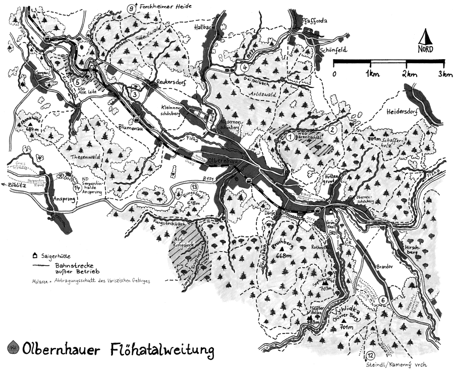 Das Flöhatal bei Olbernhau ist eine Besonderheit unter den Tälern des Erzgebirges. Die meisten Flusstäler im Erzgebirge weisen eine Südost-Nordwestrichtung auf und sind relativ schmal sowie ziemlich tief eingeschnitten in den felsigen Untergrund. Nur das obere Flöhatal bildet bei Olbernhau eine 10 km lange und 2 km breite Talwanne. Das hat etwas mit der Entstehung der Landschaft zu tun. Im Tertiär erhielt sie ihre endgültige Gestalt. Das ehemaligen Grundgebirge zerbrach in Schollen. Die Südseite der Erzgebirgsscholle wurde gehoben, während die Nordseite in ihrer Lage verblieb. In diese schräggestellte Scholle konnten sich dann die Bäche und Flüsse, die auf dem Südrand der Scholle entstanden, tief in den Untergrund einschneiden.