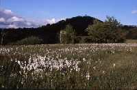 Nährstoffärmere Quellbereiche werden von sauren Kleinseggenrasen eingenommen, sofern es sich um regelmäßig gemähte Wiesen handelt. Neben verschiedenen Seggen (Wiesen-Segge, Igel-Segge, Hirse-Segge, Aufsteigende Gelb-Segge) fallen hier ab Ende Mai die leuchtend weißen Früchte des Schmalblättrigen Wollgrases auf. Besonders arme Naßstellen entwickeln Torfmoospolster und vermitteln damit schon zu den echten Mooren. Wenn Feuchtwiesen oder Seggensümpfe beweidet oder sonst irgendwie gestört werden, aktiviert sich meistens die Samenbank im Boden, die in solchen Biotopen weit überwiegend aus unzähligen Binsensamen besteht. Spitzblütige Binse und Flatterbinse kommen dann zur Dominanz, nur vergleichsweise wenige der zahlreichen Feuchtwiesenarten gedeihen hier noch, z.B. Sumpf-Hornklee, Kleiner Baldrian und Sumpf-Veilchen.