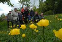 Ihren bunten Höhepunkt erreichen die Bergwiesen dann Anfang Juni: das Gelb stammt vom Weichen Pippau und den tausenden Blütenköpfen der Trollblume, die hier ihr weitaus umfangreichstes sächsisches Vorkommen besitzt, außerdem steuern Blutwurz-Fingerkraut und vereinzelt die Niedrige Schwarzwurzel etwas gelbe Farbe bei. In den feuchteren Bereichen gesellen sich die rotvioletten Blüten der Breitblättrigen Kuckucksblume hinzu und bilden vor allem entlang des Klengelsteiges im Nordosten des Gesingberges einen herrlichen Kontrast zu den hier ebenfalls gehäuft auftretenden Trollblumen. Weitaus weniger zahlreich ist eine andere Orchideenart, der Große Händelwurz. Zu dieser Familie zählt auch das unscheinbare, weil grün blühende Große Zweiblatt. Über den Blütenteppich hinaus erheben sich ab Mitte Juni die Blütenstände des Wiesen-Knöterichs und der Ährigen Teufelskralle, während das Gemeine Kreuzblümchen kurzrasige Stellen bevorzugt, die schon zu den Borstgrasrasen überleiten. Eben dort, etwas weiter entfernt vom Basaltgipfel, wo dessen basische Sickerwässer kaum noch Einfluß haben, beginnt Mitte Juni auch die Arnika zu blühen, die es eher etwas sauer mag. Auf den feuchteren Bergwiesen hingegen gehört die zweite Junihälfte der Alantdistel und der Großen Sterndolde.