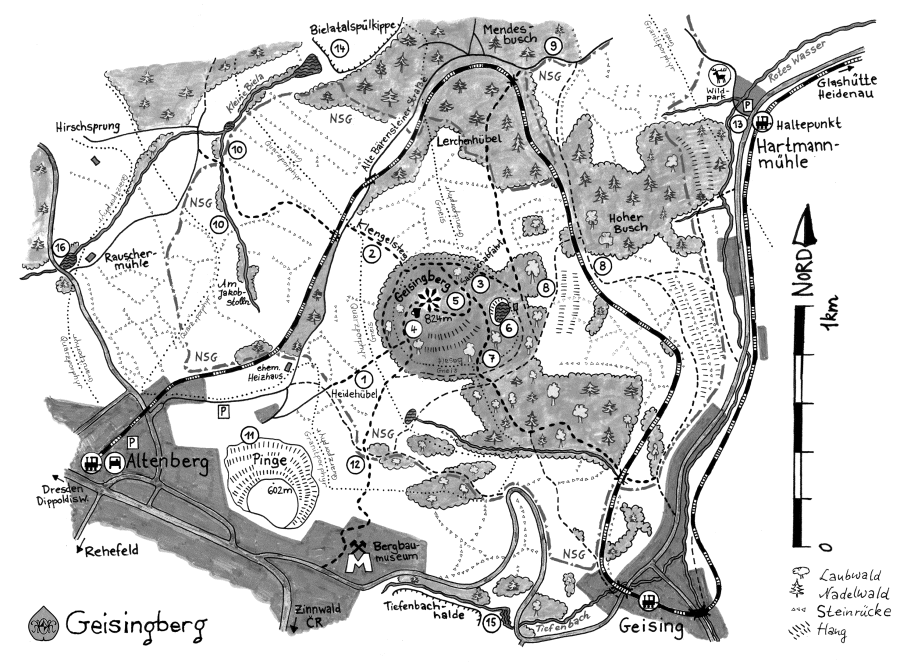 Damals rückte auch das Geisingberggebiet ins Blickfeld der Sommerfrischler, die der Enge Dresdens entflohen und im Gebirge Erholung suchten. Sie genossen die Aussicht vom 1891 errichteten Louisenturm, nutzten die Wintersportmöglichkeiten (Sachsenabfahrt und Sprungschanze im Nordosten) und erfreuten sich an der hier besonders üppigen Wiesenblumenpracht. Mit ihnen kamen Botaniker wie Oskar DRUDE (1902, 1908) und Arno NAUMANN (1922, 1923), die die Pflanzengemeinschaften der Bergwiesen genauer untersuchten und beschrieben. Gleichzeitig aber setzte der Abbau des Basalts ein, der als Schottermaterial, z.B. für den Eisenbahnbau, Verwendung fand. 1923 wurde die Schmalspurbahn, die bereits 33 Jahre zuvor von Heidenau aus Geising erreicht hatte, bis Altenberg weitergebaut. In weitem Bogen schnauften nun die Dampfloks um den Geisingberg herum, aus heutiger Sicht sicherlich ein romantisches Bild. Doch mit Sicherheit wurden bereits damals die ersten Rauchschäden an den ohnehin sehr exponierten Waldbeständen verursacht.