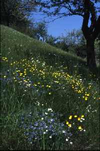 Besonders artenreich sind die südexponierten Hangwiesen. Auf nicht allzu stark geneigten Flächen bzw. am Mittelhang größerer Hangwiesen treten dabei neben dem namensgebenden Gras, dem Glatthafer, vor allem folgende Arten in Erscheinung: Rundblättrige Glockenblume, Rauhaariger Löwenzahn, Acker-Witwenblume, Margerite, Körnchen-Steinbrech, Gamander-Ehrenpreis, Knolliger Hahnenfuß und Acker-Hornkraut. Besonders im Mai ergeben sich dabei herrliche, farbenprächtige Blühaspekte, während ab Mitte Juni in trockenen Sommern die Vegetation bei ausbleibender Mahd schnell vergilben kann. An den Unterhängen sammeln sich die von den Flächen abgespülten Nährstoffe, meist behindern auch die angrenzenden Bäume die Sonneneinstrahlung und damit die Verdunstung. Hier sind die Wiesen weniger artenreich, konkurrenzkräftige Gräser und Stauden setzen sich durch, wie Fuchsschwanz, Knaulgras, Sauerampfer, Wiesen-Kerbel und Weiches Honiggras. Die Oberhänge hingegen bieten Lebensraum für "Hungerkünstler" und Wärmezeiger. Die Böden hier sind meist flachgründig, warme Luft aus dem Tal steigt hierher auf und staut sich unter dem Trauf der angrenzenden Gehölze. In den lückigen Rasen aus Rot- und Schaf-Schwingel wachsen Pechnelke, Feld-Thymian, Nickendes Leimkraut, Heide-Nelke, Zittergras, Kriechende Hauhechel, Gewöhnliches Kreuzblümchen und Kleines Habichtskraut. Die meisten solcher zu den Halbtrockenrasen überleitenden Magerwiesenbereiche sind aber bereits verschwunden, da in diesen lückigen Rasen auch Gehölze sehr schnell keimen und aufwachsen können.