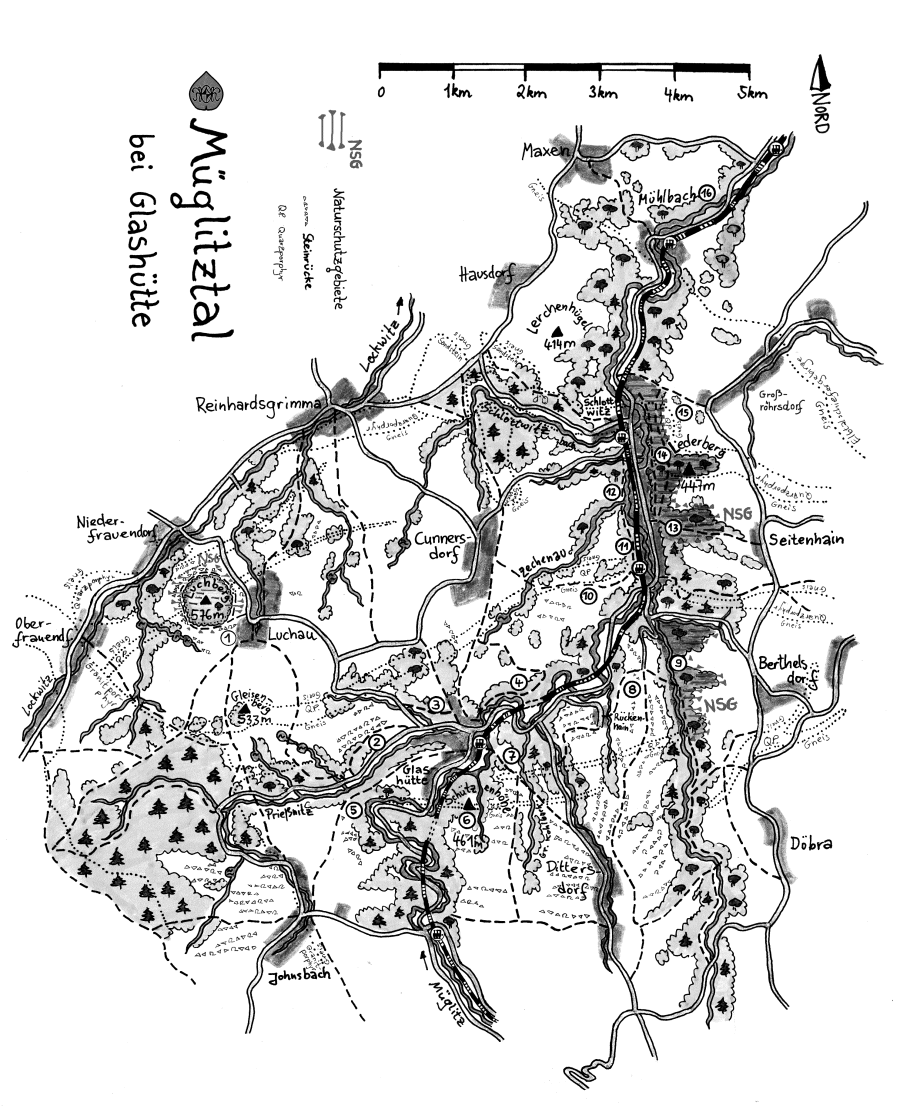 So ähnlich entstand der Mittellauf der Müglitz. Was auf der Landkarte wie das Bild einer Treppe erscheint, ist in natura eines der reizvollsten Täler des Erzgebirges. Rauschend durcheilt das Wasser schroffe Kerbtalabschnitte, um sich anschließend in breiteren Auen zu entspannen und einen Teil dieser Energie abzugeben (was allerdings heute durch die Bebauung dieser Talsohlen nicht mehr möglich ist). Steile, felsige Prallhänge einerseits und moderate Gleithänge andererseits; dazu noch mehrere Seitentäler, die kaum weniger interessante Natureindrücke versprechen: Prießnitz, Zechenau und Schlottwitzgrund fließen der Müglitz von links zu, die beiden Kohlbachtäler, Dittersdorfer Bach und Trebnitz von rechts. Der rasche Wechsel von Hangrichtungen und -neigungen bedingt ein ebenso kleinflächiges Neben- und Übereinander verschiedener Mikroklimate und unterschiedlicher Vegetation. Sehr deutlich ist dies beispielsweise im West-Ost-verlaufenden Prießnitztal zu erkennen. In Glashütte wurde schon immer die "Sommerseite" von der "Winterseite" unterschieden.