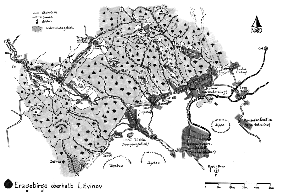 Die Kontraste zwischen Natur und Industrie könnten kaum größer sein als bei Litvínov/Oberleutensdorf! Schöne Berglandschaft mit Laubmischwäldern und Bergwiesen grenzt hier unmittelbar an die menschengemachte "Mondlandschaft" gigantischer Tagebaue, umgeben von Chemiefabriken, Großkraftwerken und Plattenbaustädten. Die historischen Siedlungen und die einstmals reizvolle Natur des Nordböhmischen Beckens sind größtenteils der fortschreitenden Braunkohleförderung zum Opfer gefallen. Selbst vor der alten Königsstadt Most/Brüx machte der Bergbau nicht Halt. Nur wenige Kulturdenkmäler - wie die 1975 auf Rollen aus dem Tagebaugebiet herausgeschobene Maria-Himmelfahrt-Kirche in Most/Brüx oder die Wallfahrtskirche von Mariánské Radcice/Maria-Ratschitz - konnten gerettet werden.