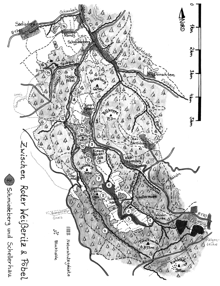 Der von Roter Weißeritz und Pöbeltal eingeschlossene Riedel tritt deshalb nach Nordosten zu immer steiler in Erscheinung, wenngleich seine absolute Höhe abnimmt (vom Pöbelknochen - 833 m, über Stephanshöhe - 804 m, Spitzberg - 699 m, Hofehübel - 693 m, zum Brand - 661 m). Besonders bei Bärenfels, wo sich die beiden Bäche auf rund 700 Meter Luftlinie nähern, bekommt die Landschaft einen ausgesprochen gebirgigen Charakter. Der Höhenunterschied zwischen dem höchsten Punkt des Hofehübels und der Pöbeltalsohle oberhalb der Wahlsmühle beträgt 155 Meter (auf 300 Meter Entfernung!), auf der anderen Seite geht es 130 Meter herab zur Bärenfelser Mühle an der Roten Weißeritz.