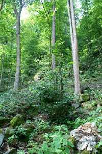 Feuersalamander setzen ihre Larven in den fischfreien Seitenbächen ab. Die durch EU-Agrarförderungen erzwungene Bewirtschaftung der Ackerflächen bis hart an die Hangkante des Naturschutzgebietes sowie der verstärkte Maisanbau führen immer wieder zu Erosionen. Nach sommerlichen Starkniederschlägen werden die kleinen Feuersalamanderlarven von dem in den Seitenbächen herabstürzenden Schlamm fortgespült - oder sie ersticken darin.
