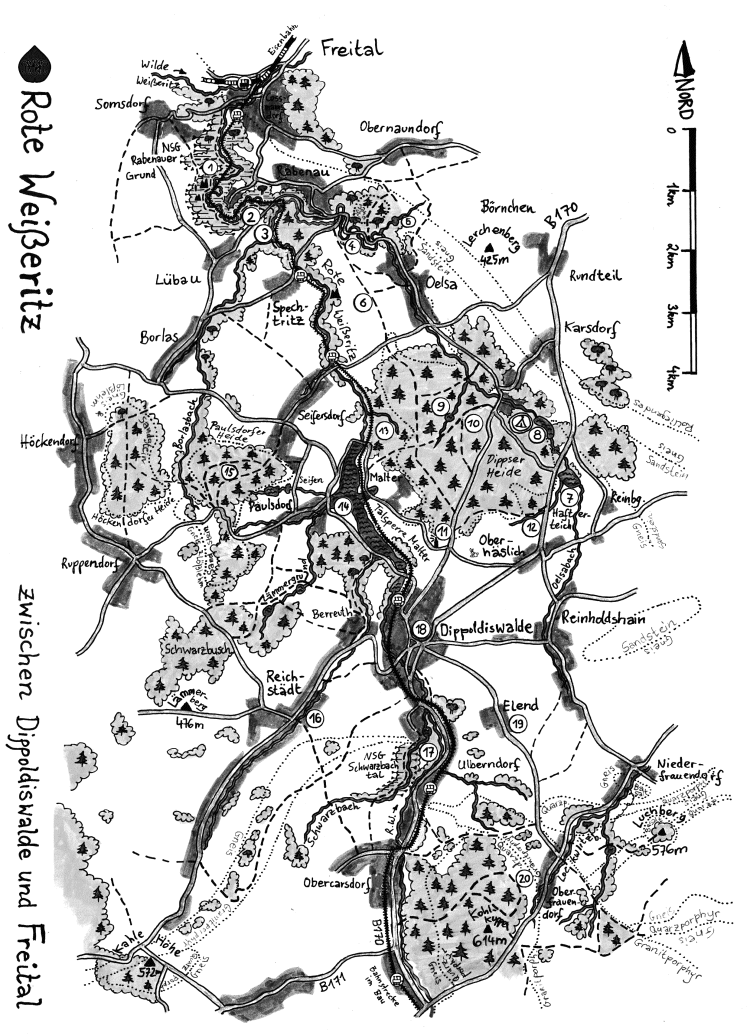 Ganze zehn Kilometer Luftlinie liegen die beiden Städte Dippoldiswalde und Freital auseinander, doch bei einer Wanderung begegnen dem Naturfreund auf diesem engen Raum höchst unterschiedliche Landschaften: ausgeräumte Agrarfluren einerseits und zusammenhängende Waldflächen andererseits, der markante Rücken der Wendischcarsdorfer Verwerfung im Nordosten und, ganz in der Nähe, der schluchtartige Einschnitt des Rabenauer Grundes. Mehrere Teiche und die Wasserfläche der Talsperre Malter bereichern zusätzlich die Gegend.